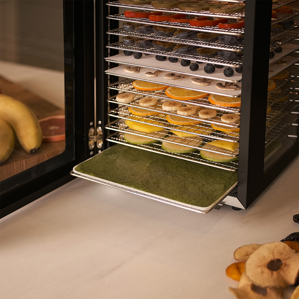Чёрный корпус из нержавеющей стали, устойчивый к нагреву, влаге и коррозии, выглядит лаконично и современно, легко вписывается в интерьер кухни или мастерской. Внутри установлено 14 поддонов из нержавеющей стали с зазором 25 мм — этого достаточно, чтобы удобно размещать ломтики фруктов, травы или мясные полоски.