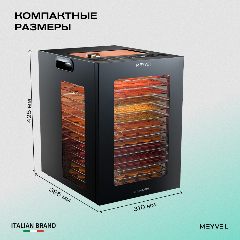 Meyvel MDH14-2S (Black) — это современный дегидратор, который создан для тех, кто хочет заготавливать фрукты, овощи, мясо, травы и ягоды без потери их вкуса и пользы круглый год. Прочный корпус, продуманная конструкция и умная электроника превращают его в надёжного помощника на каждый сезон.