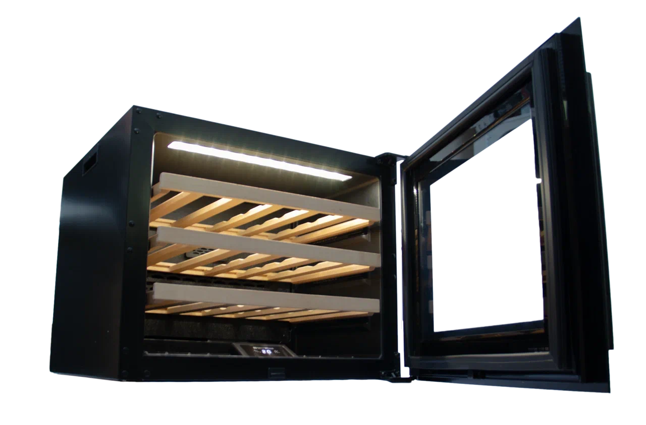 Благодаря стеклянной двери с УФ-тонировкой, гарантирующей защиту вин от солнечного света, можно изучать содержимое, не открывая шкаф. Полки из дерева обеспечивают безопасное размещение бутылок, а мягкая светодиодная подсветка придает шкафу элегантность.